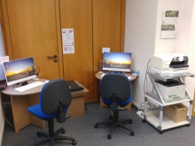 Ausdrucke sind von allen PCs auf einem Schwarz-Weiß-Laserdrucker (0,20 € pro Seite) oder einem Farb-Tintenstrahldrucker (0,25 € pro Seite) möglich, außerdem können Sie Ausdrucke auf Fotopapier machen (0,30 € pro Foto 10 x 15 cm). Sie k nnen Ihre Daten auch auf USB-Stick bzw. Speicherkarte bertragen oder auf CD-ROM (erhältlich für 0,50 € pro Rohling) brennen. Auch ein Farbscanner zum Einlesen und Weiterverarbeiten von Dokumenten steht bereit.